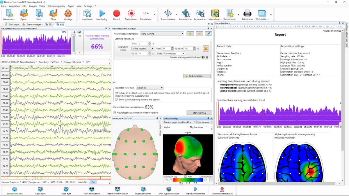 Neuron-Spectrum-1/BFB, la nueva solución de Neurosoft, ofrece una amplia personalización de los perfiles de entrenamiento para cada paciente de manera individual, utilizando una amplia gama de biofeedback. Nuestros potentes registradores de EEG proporcionan la más alta calidad de señal fisiológica, y el software Neuron-Spectrum.NET permite evaluar el éxito del entrenamiento y generar automáticamente el informe.