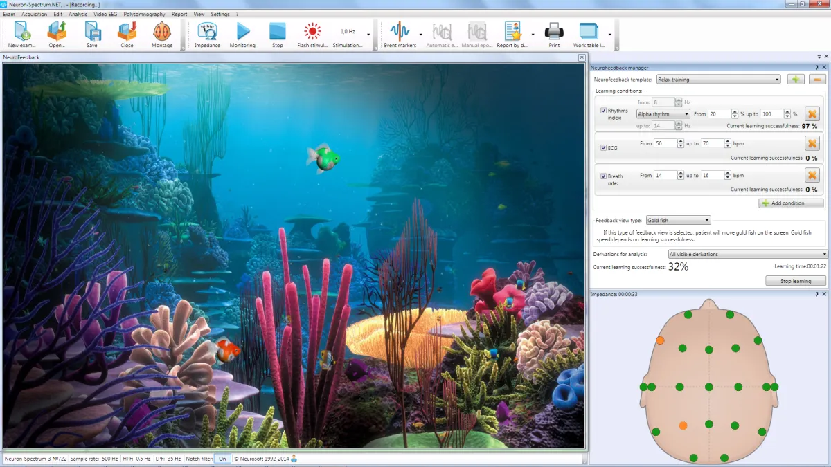 El software Neuron-Spectrum-1/BFB incluye entrenamientos estándar de Alfa-teta y beta-entrenamiento, pero siempre puedes crear un programa de entrenamiento individual para cada paciente. No limitamos el número de canales de EEG, puedes realizar entrenamientos utilizando hasta 21 canales de EEG.