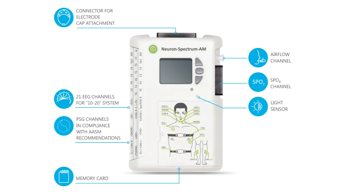 Además de las 21 entradas de EEG, el Neuron-Spectrum-AM incluye un conjunto completo de entradas PSG conforme a las recomendaciones de la AASM*. También tiene un oxímetro de pulso incorporado para estimar el nivel de saturación de oxígeno (SpO2) durante el sueño. Las salidas en el panel lateral permiten conectar el sensor de flujo de aire (termistor y cánula), sensores de esfuerzo torácico y abdominal, sensor de ronquidos, sensor de corriente continua (DC), y conectar electrodos para registrar EMG, ECG y EOG. El dispositivo cuenta con un sensor de luz y un sensor de posición corporal integrados. El Neuron-Spectrum-AM puede utilizarse como un sistema PSG portátil avanzado.