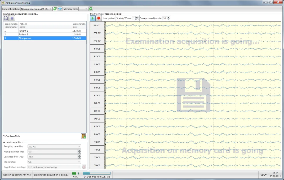 Las modernas tecnologías de ahorro de energía aplicadas en el Neuron-Spectrum-AM permiten grabar exámenes de hasta varios días de duración. El cambio en caliente de la batería durante la adquisición garantiza la realización de exámenes de larga duración. La tarjeta de memoria de 32 Gb almacena más de 30 días de grabación continua.