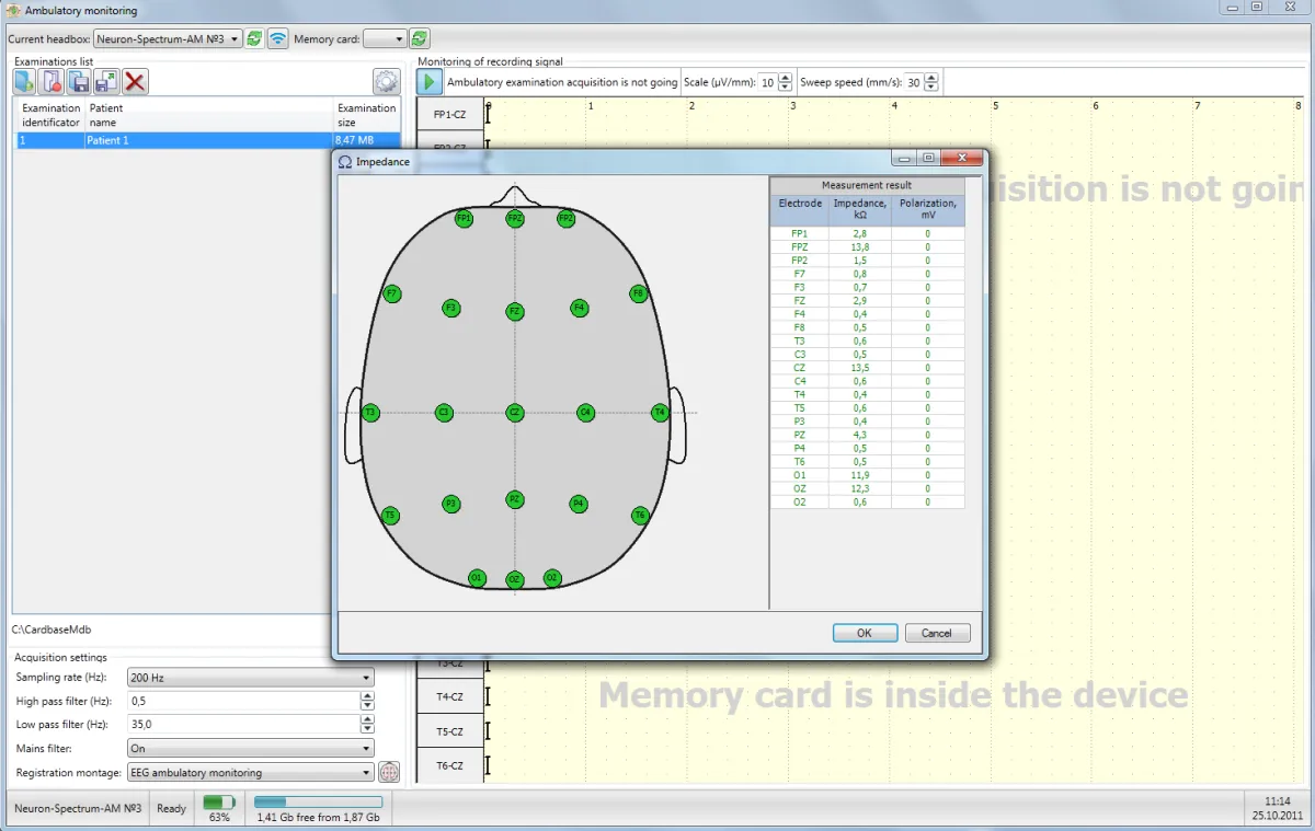 La calidad de la señal obtenida depende directamente de la calidad de la colocación de los electrodos. El dispositivo Neuron-Spectrum-AM permite medir la impedancia tanto antes de iniciar la adquisición como durante la adquisición misma. Esta opción permite reposicionar los electrodos si la calidad de la colocación no es satisfactoria. Los resultados de la medición de impedancia se guardan junto con los datos del examen. Al utilizar esta información durante la revisión y análisis, el especialista siempre puede evaluar la fiabilidad de los resultados obtenidos. Esta opción es especialmente importante para el monitoreo de EEG a largo plazo.